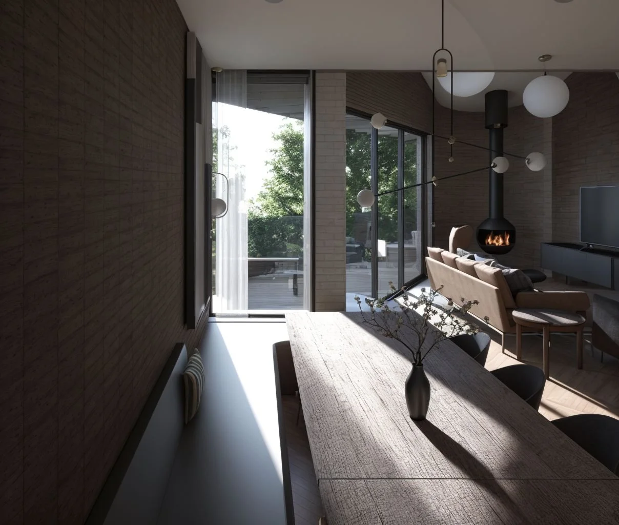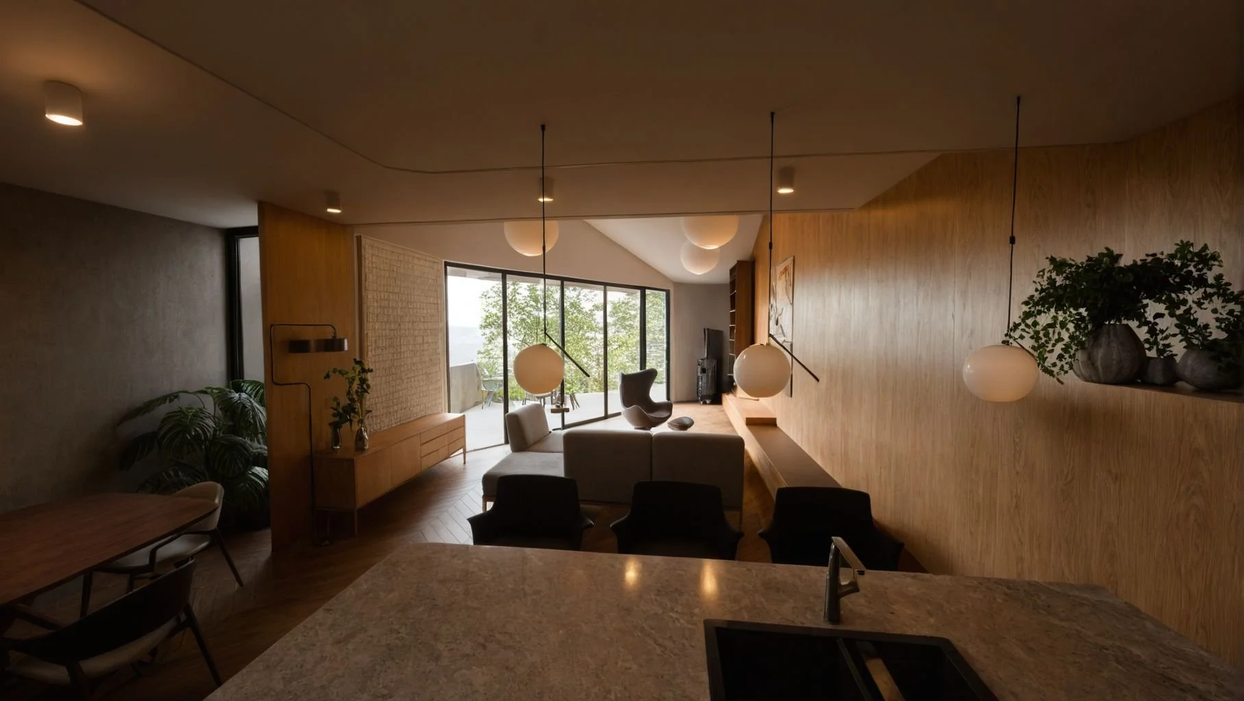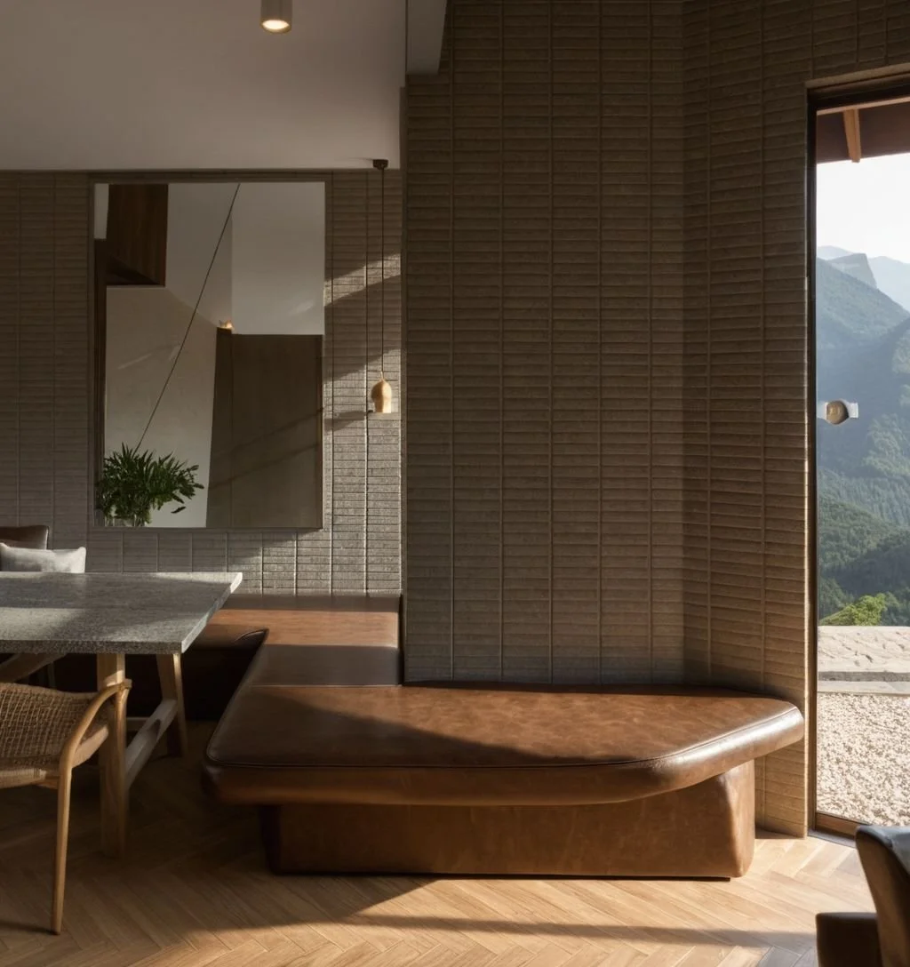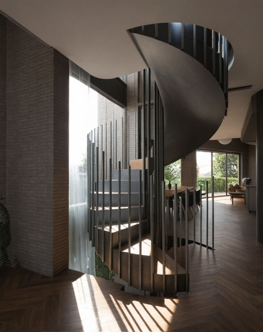 This residential project explores the intersection of sculptural architecture, refined detailing, and natural materiality to create a home that feels both grounded and elevated. The interiors are defined by warm timber linings, integrated joinery, and a calm, minimalist aesthetic. Expansive glazing frames views of the surrounding landscape and draws in natural light, while curated pendant and wall lighting brings softness and rhythm to the space. A sculptural cast in situ concrete spiral staircase forms the architectural heart of the home, acting as both a functional connector and a striking design element. Custom banquette seating, built-in storage, and tactile finishes—including stone, leather, and timber—highlight a commitment to craftsmanship and considered design.